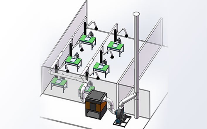 吸气臂集中收集主要是针对治理在机械加工、铸造厂、粉料回收、焊接实训室、食品加工,焊接烟尘、切割、打磨、家具生产等行业生产时产生大量对人体有害的粉尘颗粒而设计的,处理风量4000~60000m³/h,不同的组合满足不同风量的处理要求,可满足生产车间多工序的粉尘收集处理,收集方式有移动吸臂式和固定收集罩等,减少粉尘逸散到车间内,保障车间工作环境。